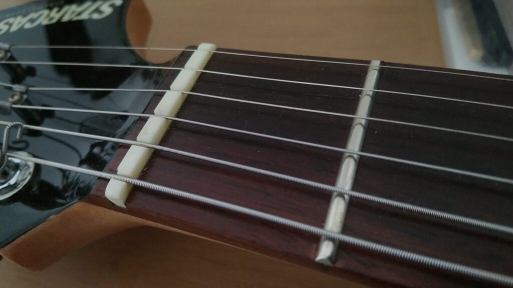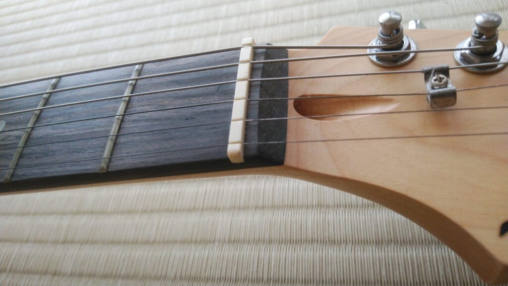 このギター、プラ製のナットは気持ち厚みが厚く作られており、F社用に用意されているナットでは若干ですが溝に隙間ができてしまいます。