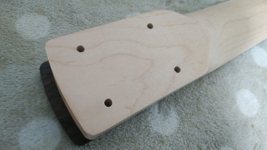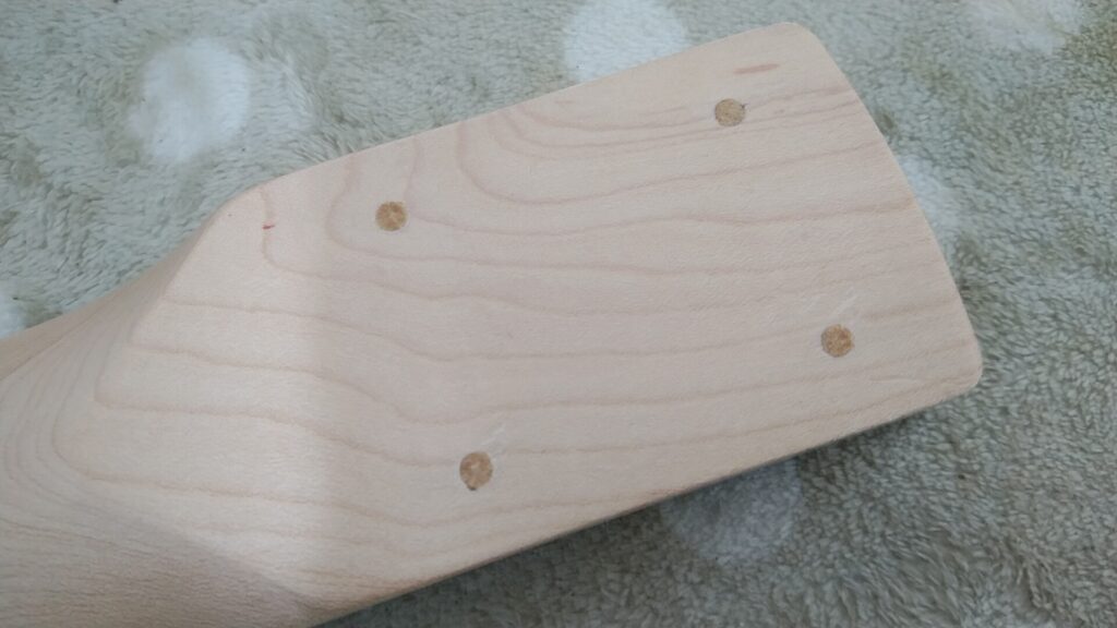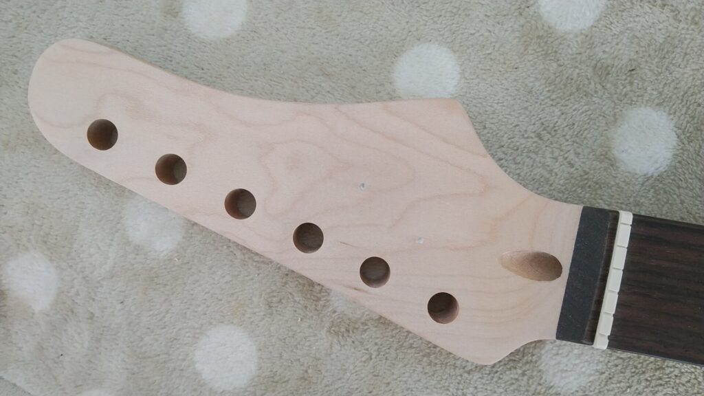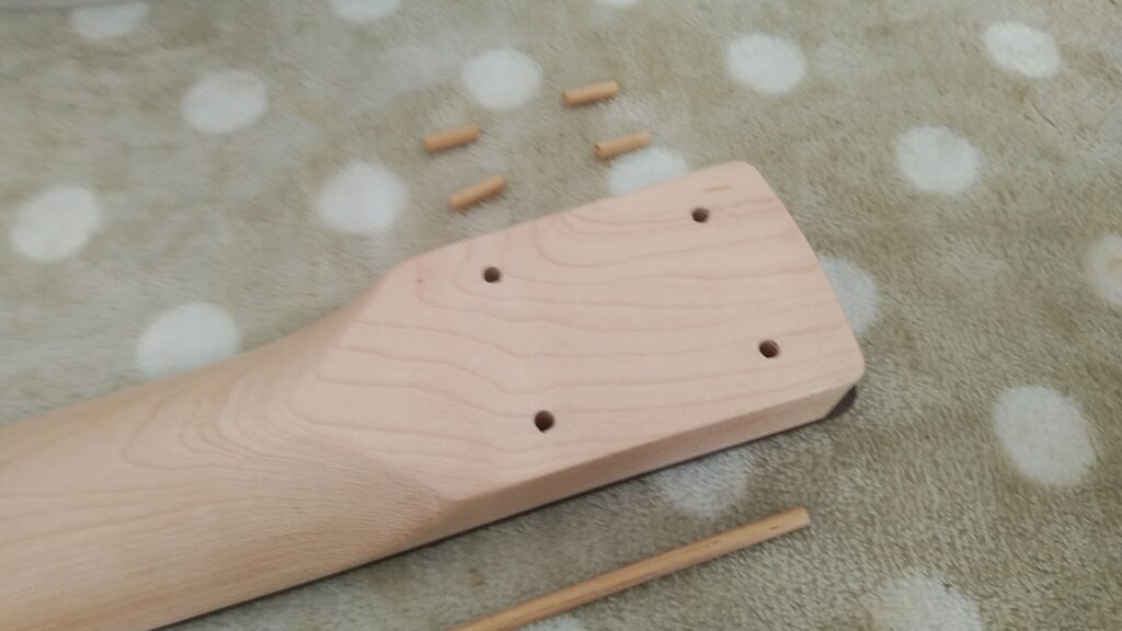 その後、指板の調整を行い、元の穴をラワン丸棒で埋めて完成です。